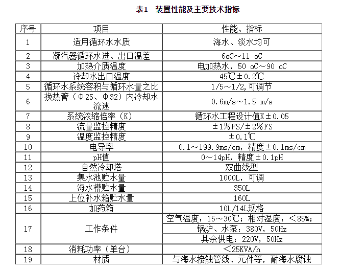 工作原理:在实验室给定条件下,用电加热水与凝汽器进行热交换,模拟电力海水循环冷却系统工程现场的流速、流态、水质、金属材质、换热强度和冷却水进出口温度等主要参数,以评定海水水处理剂的缓蚀、阻垢和杀生性能。