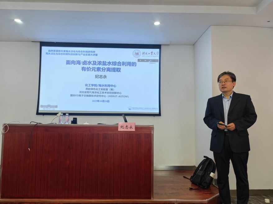 纪志永教授围绕海水淡化与浓盐水综合利用、含盐废水处置、选择吸附与膜分离技术三大核心研究方向展开分享。结合项目案例,纪教授详细阐述了钾、锂、溴等资源从海/卤水及浓盐水中分离提取的关键技术突破,介绍了从海/卤水、浓盐水中回收高价值元素的创新路径,并针对选择吸附材料与膜分离电极材料的设计开发难点进行深度解析。